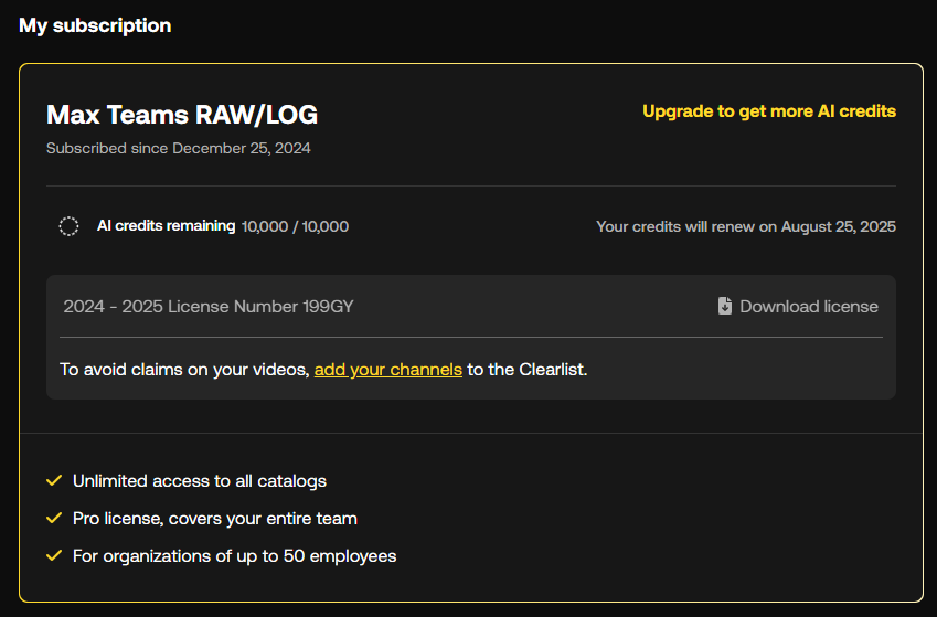 Downloading a copy of your license ensures you have proof of your legal coverage for using Artlist assets.