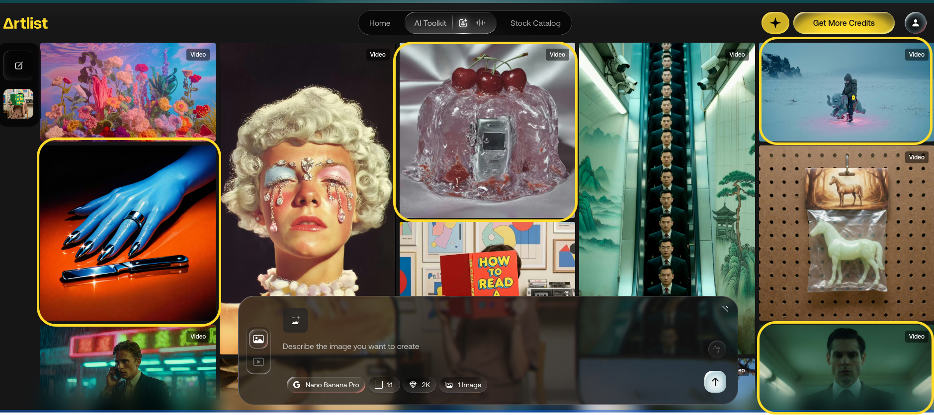 Artlist's Toolkit can help you get inspired by AI-generated images and videos, showcasing the kinds of visuals you can create with a specific model and prompt. Browsing examples is a quick way to understand which model best fits your creative goals.
